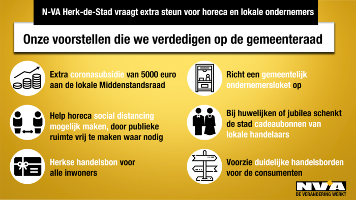 Sinds de start van de coronacrisis heeft de lokale middenstand het moeilijk. De Vlaamse en de federale overheid voorzien in een aantal compenserende maatregelen voor horeca en ondernemers die de deuren noodgedwongen moesten sluiten. Daarnaast kunnen ook lokale overheden stappen ondernemen om de gevolgen van deze crisis op te vangen. Herk-de-Stad kan op verschillende domeinen bijspringen en tegemoetkomen. Daarom stelt N-VA Herk-de-Stad extra maatregelen voor om onze lokale handelaars en horeca te steunen.